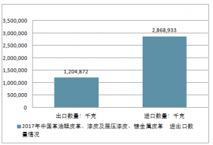2017年中國油鞣皮革、漆皮及層壓漆皮、鍍金屬皮革進出口總量4,073,805千克,進出口總金額74,386,634美元。