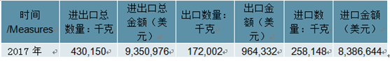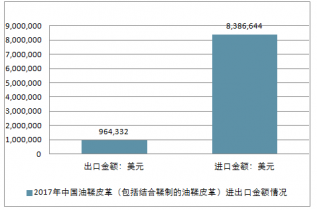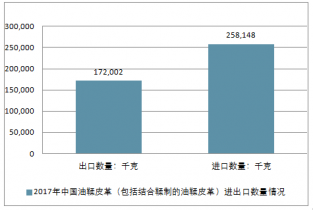 2017年中國油鞣皮革(包括結合鞣制的油鞣皮革)進出口總量430,150千克,進出口總金額9,350,976美元。