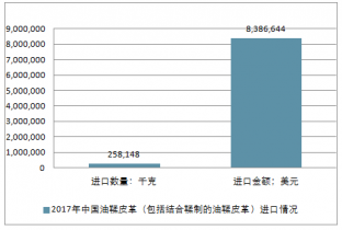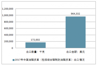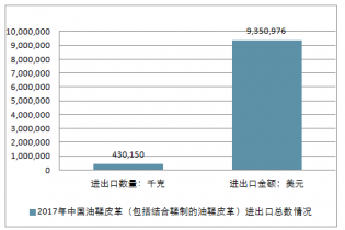 2017年中國油鞣皮革(包括結合鞣制的油鞣皮革)進出口總量430,150千克,進出口總金額9,350,976美元。