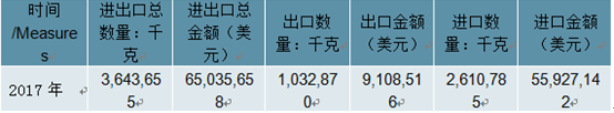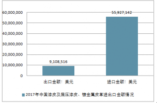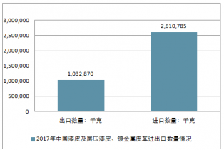 2017年中國漆皮及層壓漆皮、鍍金屬皮革進出口總量3,643,655千克,進出口總金額65,035,658美元。