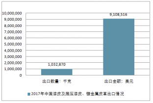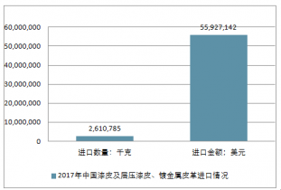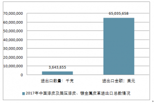 2017年中國漆皮及層壓漆皮、鍍金屬皮革進出口總量3,643,655千克,進出口總金額65,035,658美元。