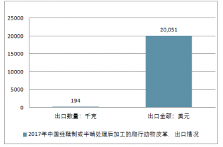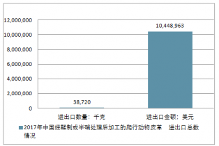 2017年中國經鞣制或半硝處理后加工的爬行動物皮革進出口總量38,720千克,進出口總金額10,448,963美元。