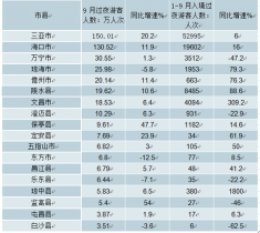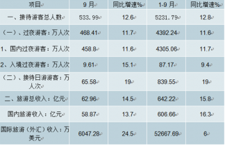 2018年1-9月海南省共接待游客5231.79萬人次,同比增長12.8%。9月份,海南省接待游客總?cè)藬?shù)達533.99萬人次,同比增長12.6%。其中:過夜游客468.41萬人次,同比增長11.7%,國內(nèi)過夜游客458.8萬人次,同比增長11.6%,入境過夜游客9.61萬人次,同比增長15.1%;9月接待一日游游客人數(shù)65.58萬人次,同比增長19%。1-9月旅游總收入為642.22億元,同比增長15.8%;9月旅游總收入62.96億元,同比增長14.5%。其中:國內(nèi)旅游收入58.87億元,同比增長13.7%;旅游外匯收入6047.28萬美元,同比增長24.5%。