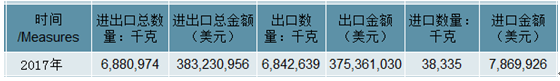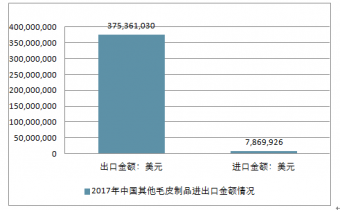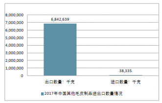 2017年中國其他毛皮制品進出口總量6,880,974千克,進出口總金額383,230,956美元。