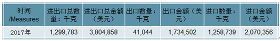 2017年中國未縫制的頭、尾、爪及其他塊、片進出口總量1,299,783千克,進出口總金額3,804,858美元。
