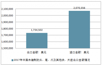 2017年中國未縫制的頭、尾、爪及其他塊、片進出口金額情況