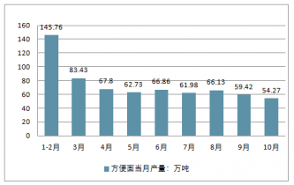 2018年10月全國方便面產(chǎn)量為54.27萬噸,同比下降4.2%。2018年1-10月全國方便面產(chǎn)量為668.37萬噸,同比增長0.09%。