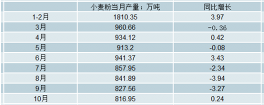 2018年1-10月全國小麥粉當月產(chǎn)量及增長走勢