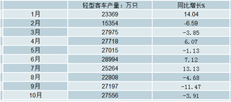 2018年10月輕型客車產(chǎn)量為27556輛,同比下降3.91%。2018年1-10月輕型客車產(chǎn)量為246306輛,同比下降2.38%。