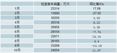 2018年10月輕型客車銷量為24054輛,同比下降11.67%。2018年1-10月輕型客車銷量為240056輛,同比下降3.86%。