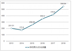 2013-2018年手機(jī)用OLED出貨量走勢