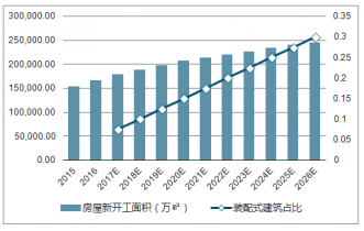 2015-2026年中國(guó)房屋新開(kāi)工面積及裝配式建筑占比情況