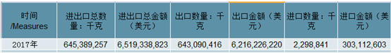 2017年中國(guó)以塑料片或紡織材料作面的手提包進(jìn)出口總量645,389,257千克,進(jìn)出口總金額6,519,338,823美元。