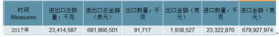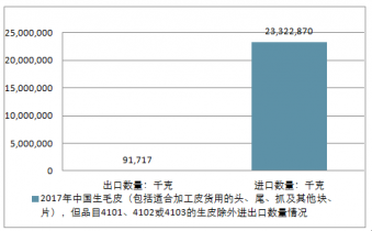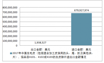2017年中國生毛皮(包括適合加工皮貨用的頭、尾、抓及其他塊、片),但品目4101、4102或4103的生皮除外進出口總量23,414,587千克,進出口總金額681,866,501美元。