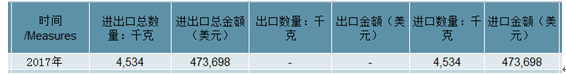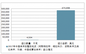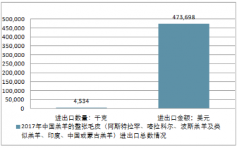 2017年中國羔羊的整張毛皮(阿斯特拉罕、喀拉科爾、波斯羔羊及類似羔羊、印度、中國或蒙古羔羊)進出口總量4,534千克,進出口總金額473,698美元。