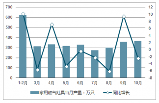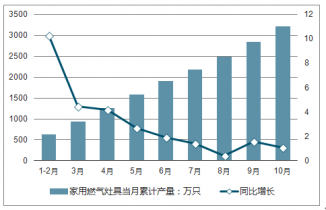 2018年1-10月中國家用燃氣灶具產量及增長情況