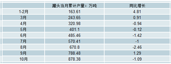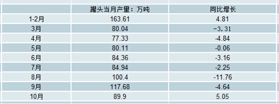 2018年10月全國(guó)罐頭產(chǎn)量為89.9萬(wàn)噸,同比增長(zhǎng)5.05%。2018年1-10月全國(guó)罐頭產(chǎn)量為878.38萬(wàn)噸,同比下降1.09%。
