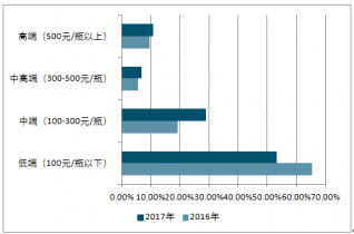 2016年和2017年中國白酒行業(yè)細分產(chǎn)品結(jié)構(gòu)對比(單位:%)