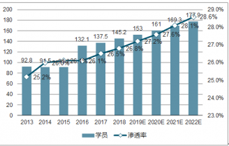 中國公務員考培規模從 2013年的 52億元增長至2019年的99億元,年復合增長率為 17.4%;主要受益于地方性校區的擴張帶動地方性參培人數快速增長,同時由于就業壓力的提升帶來培訓時長提升進而帶動 Arpu 的提升。從滲透率來看:從 2013 年的 25.2%提升至2019年的26.5%,保持穩定提升趨勢。