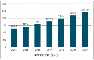 隨著智能汽車及無人駕駛的普及,車載傳感器應用需求將快速上升,單位汽車傳感器用量將持續(xù)上升。據此測算,2020 年我國車載傳感器市場將達到243.19億元,年復合增速 11.25%,保持較快增長。