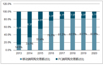 2013-2020年中國網購交易額PC端和移動端占比