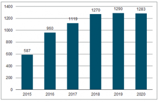 2015-2020年全球LED燈具規(guī)模(百萬具)
