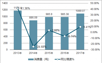 2013-2017年中國(guó)黃金消費(fèi)量統(tǒng)計(jì)情況