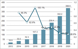 2013-2020年中國第三方支付綜合支付交易規(guī)模(萬億元)