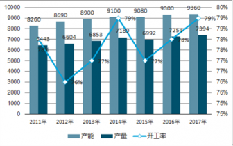 2011-2017年全球燒堿產(chǎn)能、產(chǎn)量及產(chǎn)能利用率分析