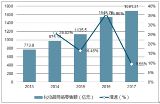 2013-2017化妝品網(wǎng)絡零售額(億元)及增速