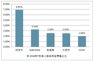 2018年7月嬰兒推車網絡零售占比前五品牌分別是:好孩子、BABYSING、昆塔斯、貝麗可和VOVO。其中,好孩子品牌嬰兒推車網絡零售額占比為6.91%,位列第.一;其次,BABYSING占3.24%,排名第二;昆塔斯位列第三,占2.55%。