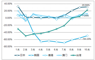中國(guó)赴亞洲主要國(guó)家及地區(qū)出境游人數(shù)增速