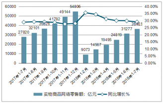 2018年1-7月,全國嬰兒尿褲網(wǎng)上零售額47863億元,同比增長29.3%。其中,實物商品網(wǎng)上零售額36461億元,增長29.1%。