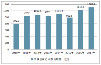 2010-2016年,我國供暖設備市場規模呈現波動遞增的趨勢,六年間的年均復合增長率為7.47%,2018年全年我國供暖設備市場規模將突破1300億元。