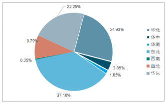 區域分布來看,東北地區占比最大份額,達到37.18%;其次是華北地區,占比為24.93%;隨后是華東地區,占比達到22.25%。