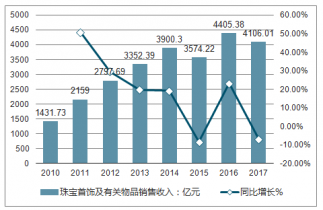 2010-2017年中國(guó)珠寶首飾及有關(guān)物品銷(xiāo)售收入及同比增長(zhǎng)走勢(shì)