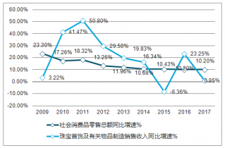 2009-2017年珠寶首飾行業(yè)增速與社會消費(fèi)品零售總額走勢對比走勢