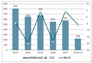2018年1-5月,我國食用植物油進口數量為224萬噸,同比下滑5.8%。2013-2018年我國食用植物油進口量在2016年為最低值553萬噸,同比下滑18.3%;2013年為最高值達810萬噸,同比下滑4.2%。