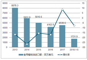 2013-2018年1-5月中國食用植物油進口金額及增長走勢