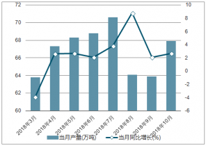 2018年2-10月中國鋁合金各月當(dāng)月產(chǎn)量及同比增長走勢