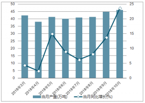 2018年2-10月中國鉛各月當月產(chǎn)量及同比增長走勢