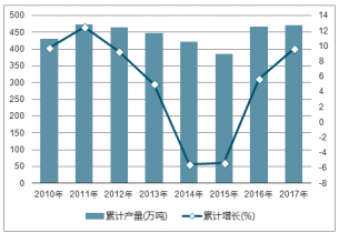 2010-2017年中國鉛產(chǎn)量及同比增長走勢