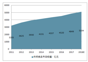 2011-2018中國(guó)休閑食品市場(chǎng)規(guī)模走勢(shì)