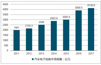 2016年我國汽車電子控制裝置市場(chǎng)規(guī)模為3909.5億元,2017年我國汽車電子控制裝置市場(chǎng)規(guī)模增長至4138.9億元。