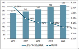 2016 -2020年全球CRO行業(yè)規(guī)模及成長性分析(億美元)