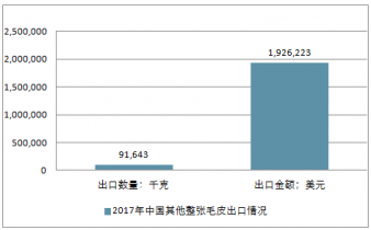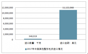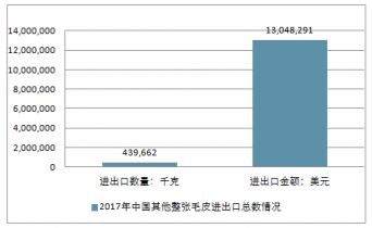 2017年中國其他整張毛皮進出口總量439,662千克,進出口總金額13,048,291美元。
