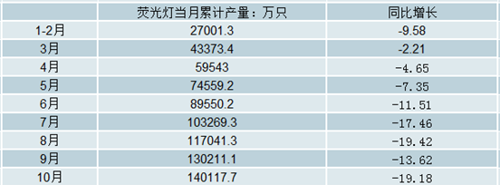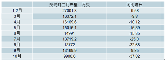 2018年1-10月全國熒光燈產量及增長情況