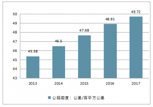 2013-2017年全國公路密度情況