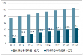 2012-2019年中國整體婚戀及網絡婚戀市場規模走勢