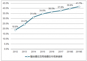 2012-2019年中國整體婚戀及網絡婚戀市場滲透率走勢